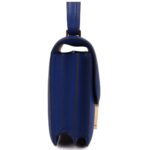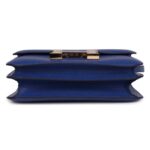 The Hermès Constance is crafted from Bleu Royal chevre leather with gold hardware and features tonal stitching. It is equipped with a metal “H” snap lock closure and an adjustable shoulder strap for versatile wear.