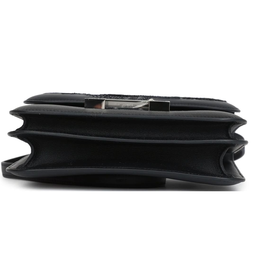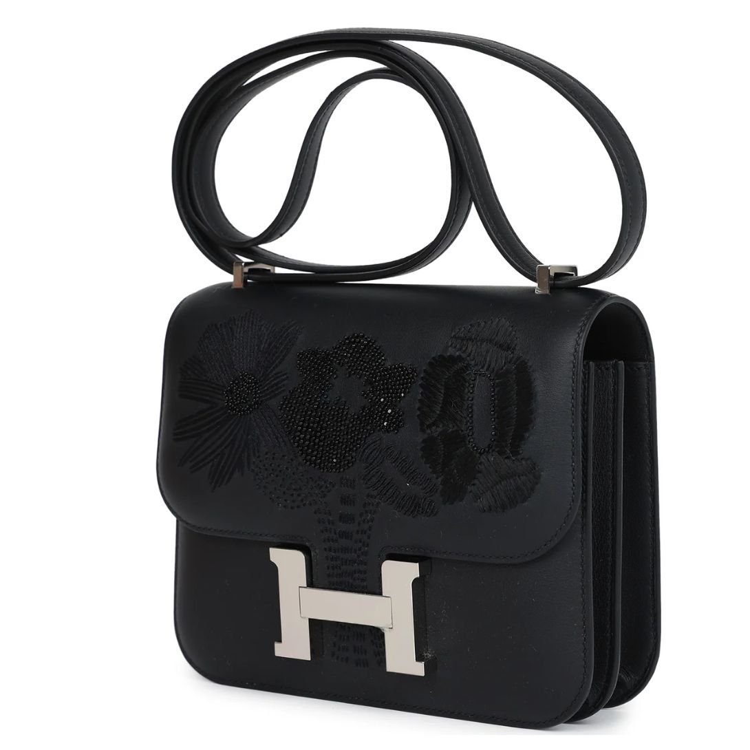 The Limited Edition “Dancing Flowers” Hermès Constance is a masterpiece of artistry and craftsmanship. Crafted in Black Swift calfskin leather with palladium hardware, it features tonal stitching and three exquisitely embroidered and beaded flowers adorning the front flap. The design is completed with the iconic metal “H” snap-lock closure and an adjustable shoulder strap, offering multiple carrying options.