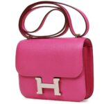This Constance is crafted from Magnolia chevre leather with palladium hardware and features tonal stitching, a metal “H” snap lock closure, and an adjustable shoulder strap.