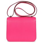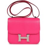 This Hermès Constance is crafted from Rose Pop Chamkila Chevre leather with palladium hardware. It features tonal stitching, a metal “H” snap lock closure, and an adjustable shoulder strap.