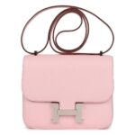 The Hermès Constance in Rose Sakura Chevre leather with palladium hardware is a sophisticated and stylish bag. It features tonal stitching and a metal “H” snap lock closure. The bag comes with an adjustable shoulder strap, providing flexibility in how it can be worn.