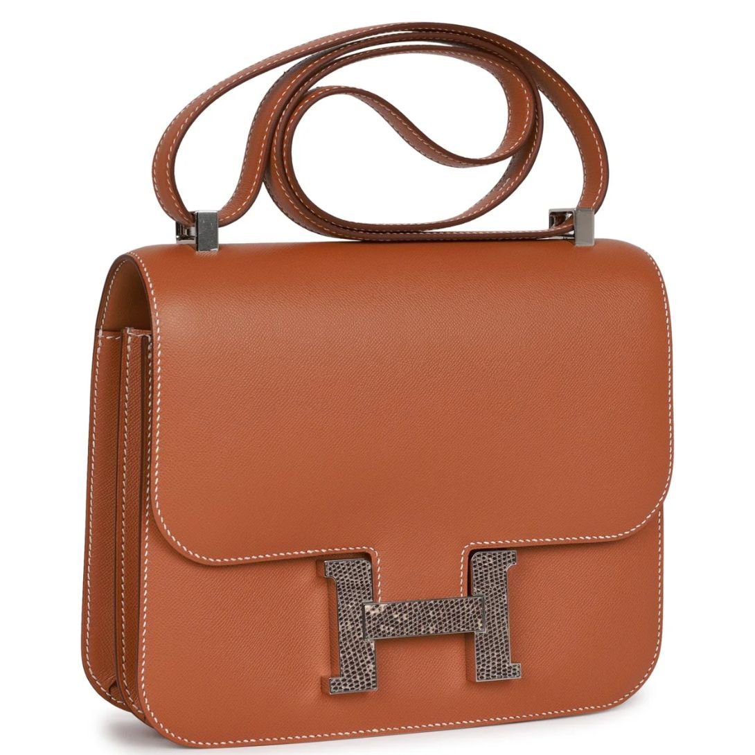 The Hermès Constance in Gold Madame leather with the ombre Lizard “H” snap lock is a perfect blend of sophistication, craftsmanship, and modern style, making it an ideal addition to any luxury collection.
