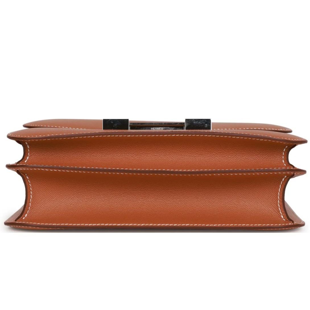 The interior is lined with Gold lambskin leather, adding a touch of opulence to the spacious design. It includes a zip pocket with an Hermès engraved pull, providing secure storage for small essentials.