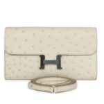 The Hermès Constance To Go Wallet exudes sophistication with its Beton ostrich leather construction and palladium hardware. Designed for versatility, it features a signature metal “H” snap closure, tonal stitching, and a removable flat shoulder strap, allowing for multistyle wear.