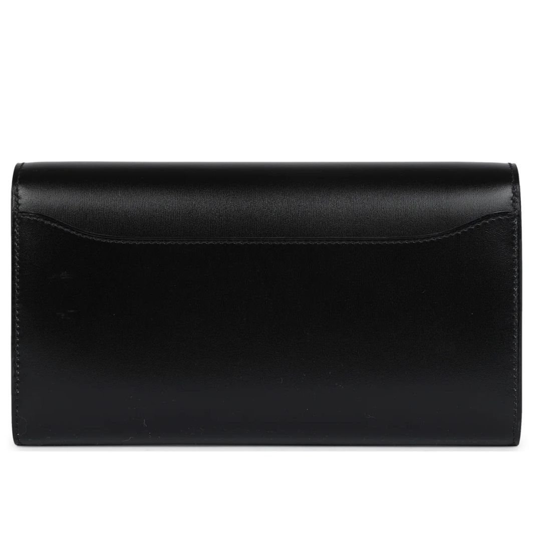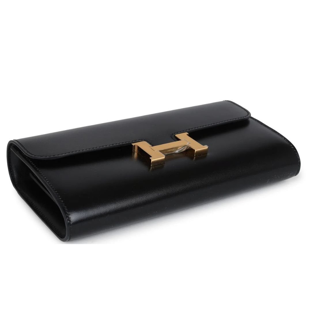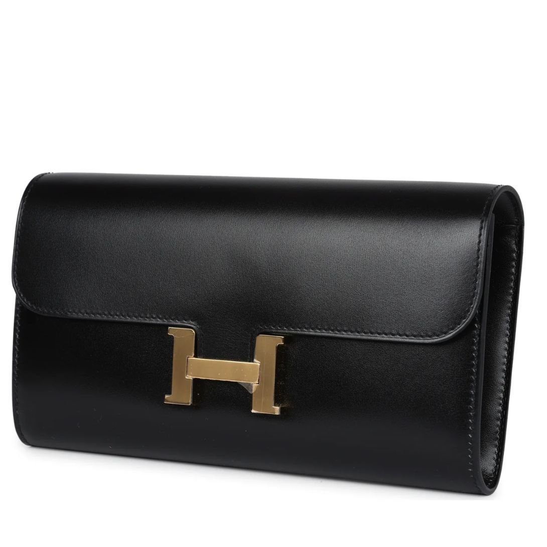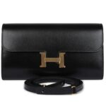 The Hermès Constance Wallet To Go is a chic and versatile accessory crafted in Black Box Calfskin leather with gold hardware. This wallet features tonal stitching, the signature Hermès “H” metal snap-lock closure, an open front compartment, and a removable crossbody strap for effortless styling.
