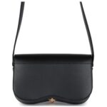 The Hermès Della Cavalleria Elan is crafted in luxurious Black Tadelakt leather with gold hardware. This elegant bag features tonal stitching, a unique rectangular shape with a curved base, and a signature gold half-bit clasp closure. The design is complemented by a flat leather buckle strap, making it suitable for shoulder or crossbody wear. Additionally, it includes a convenient exterior back pocket.