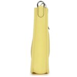 The Evelyne TPM is crafted in Limoncello clemence leather with palladium hardware, featuring tonal stitching and a pull tab top closure. It includes a removable Limoncello canvas and leather shoulder/crossbody strap for versatile carrying options.
