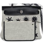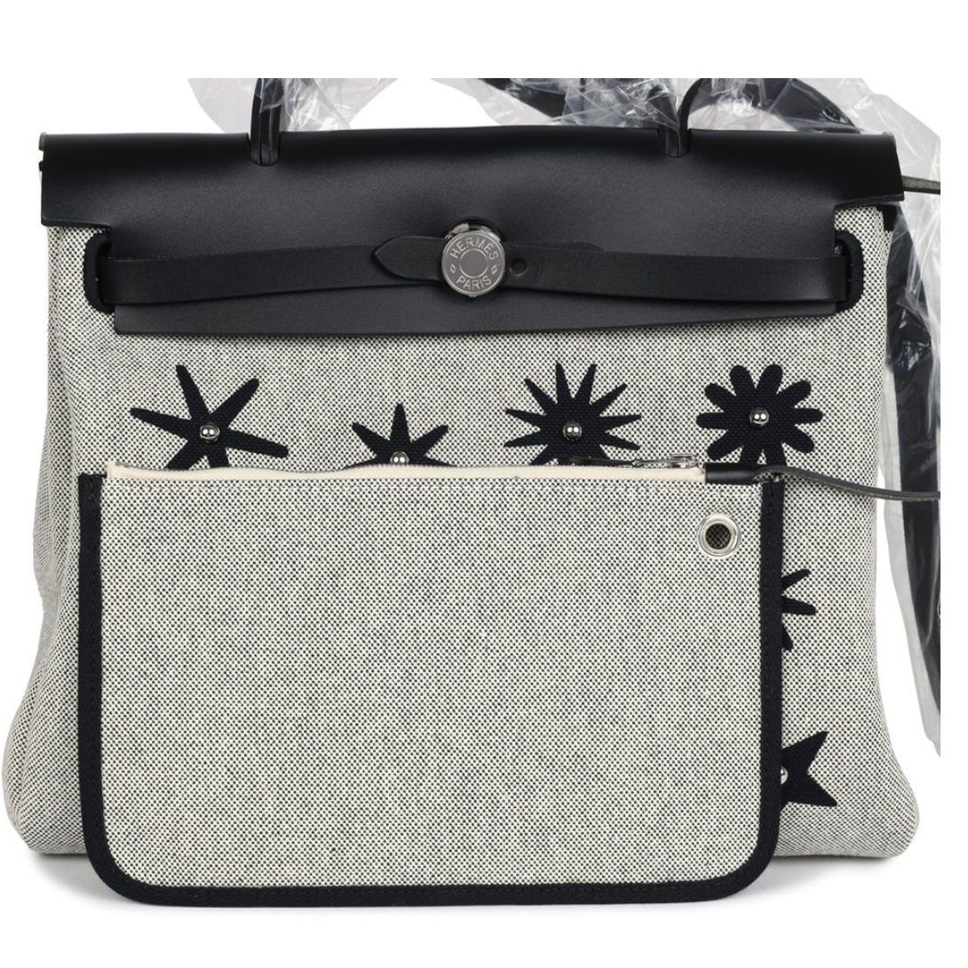 This Limited Edition Hobnailed Herbag Zip 31 PM is made from Black and Ecru Printed H Plume Canvas and Vache Hunter cowhide leather with Palladium hardware. It features tonal stitching and a “Circuit Rider” star motifs print on the front, accented with Palladium studs. The bag also has a clou de selle closure, top handle, shoulder strap in Hunter leather, clochette, an interior zip pouch, and an exterior zip pocket.