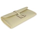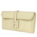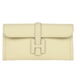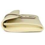 The Jige Elan 29 is a stunning clutch in Jaune Milton swift leather, showcasing tonal stitching and a sleek front “H” pullover tab closure for a minimalist yet elegant design.