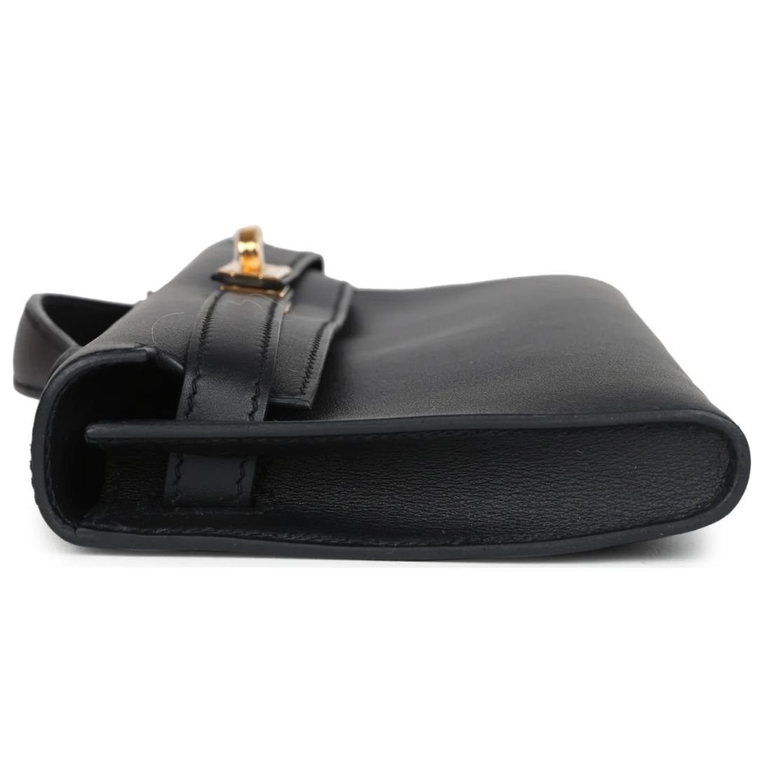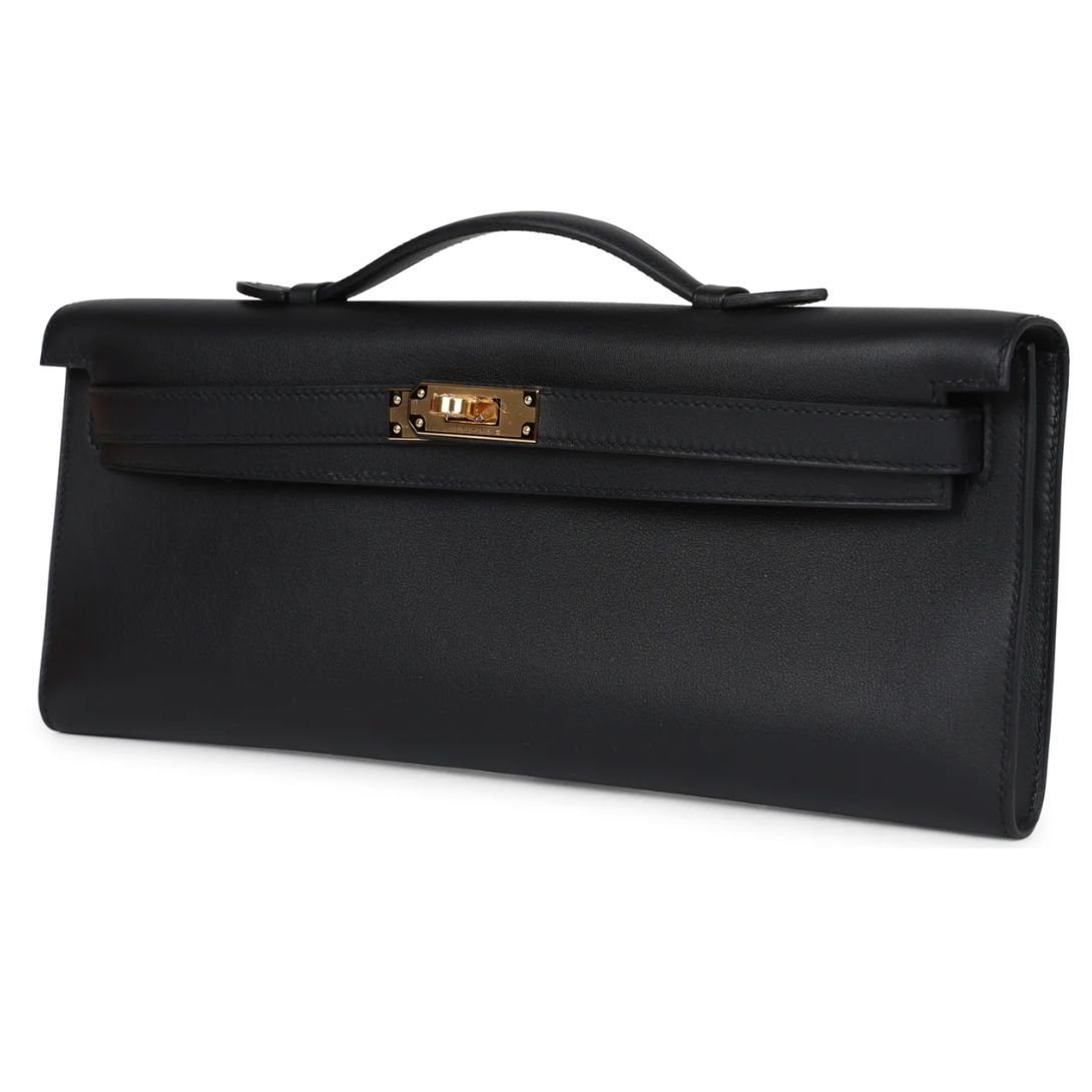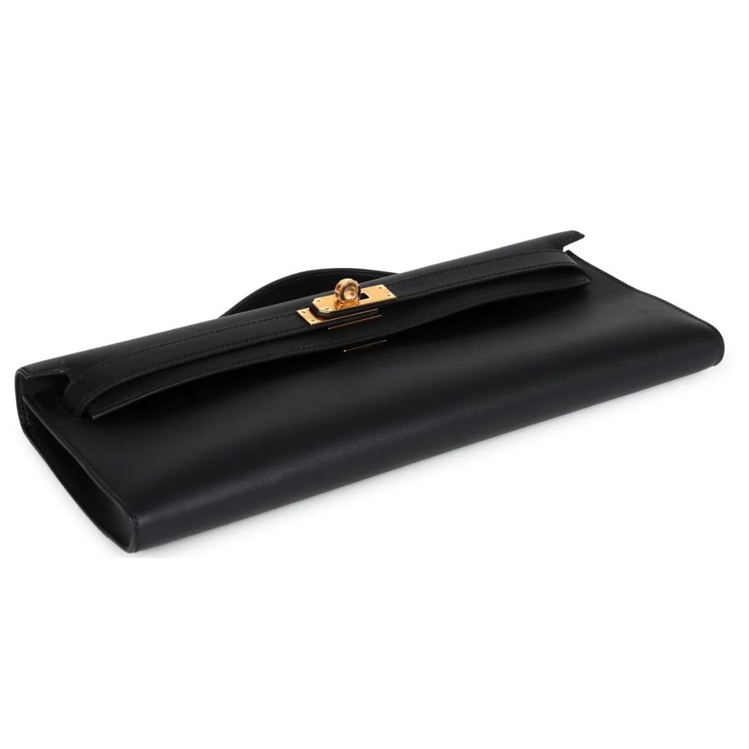 The Hermès Kelly Cut in Black Swift leather with Gold hardware is a sophisticated and timeless clutch, exuding elegance and luxury. It features tonal stitching, a signature front flap with pull straps that secure to a toggle closure, and a small top handle for versatile styling.