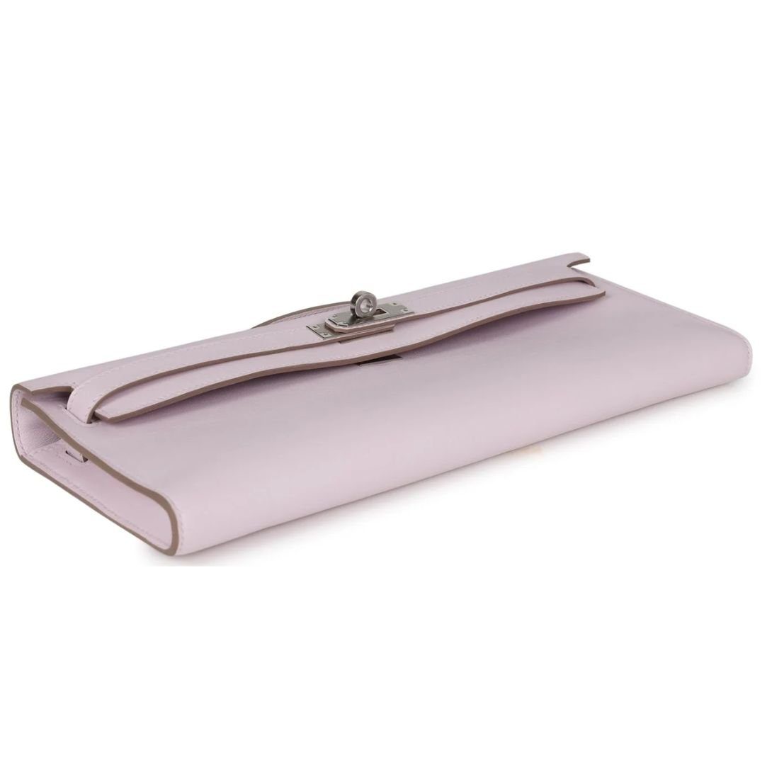 This Hermès Kelly Cut wallet in Mauve Pale swift leather with palladium hardware is a sophisticated and functional piece that blends elegance with practicality.
