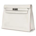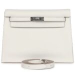 The Kelly Danse II in Gris Pale swift leather is a versatile and elegant bag featuring palladium hardware, tonal stitching, and a front flap closure with two straps. Its adjustable flat shoulder strap allows for multiple styling options, making it perfect for various occasions.