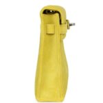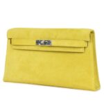 This Hermès Kelly Elan is an elegant clutch crafted in Jaune De Naples doblis leather with palladium hardware. Its refined design features two pull straps that secure with a signature toggle closure, offering a sophisticated yet functional aesthetic. A removable shoulder strap provides versatile styling options, transitioning effortlessly from clutch to shoulder carry.