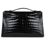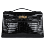 The Hermès Kelly Pochette in Black Shiny Porosus Crocodile with Gold hardware is a luxurious and sophisticated piece. It features tonal stitching, a front flap with two straps, toggle closure, and a single flat handle, offering a timeless design with an exotic touch.