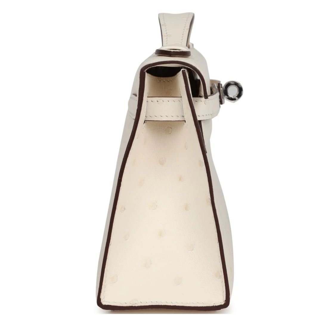 This Mini Kelly Pochette is made from Nata Ostrich leather, featuring palladium hardware and tonal stitching. It boasts a classic front flap with two straps, a center toggle closure, and a top flat handle for easy carrying.