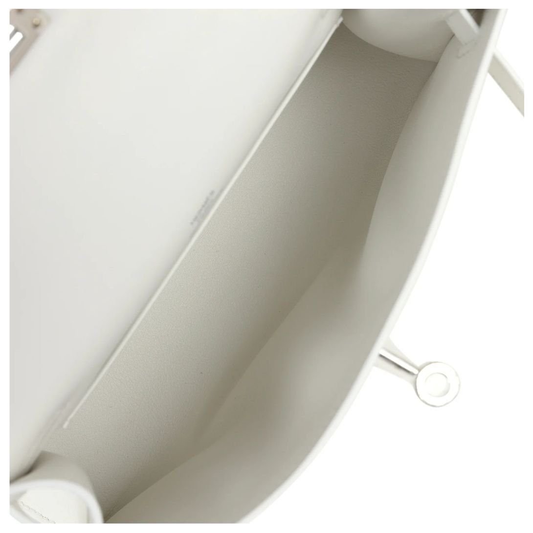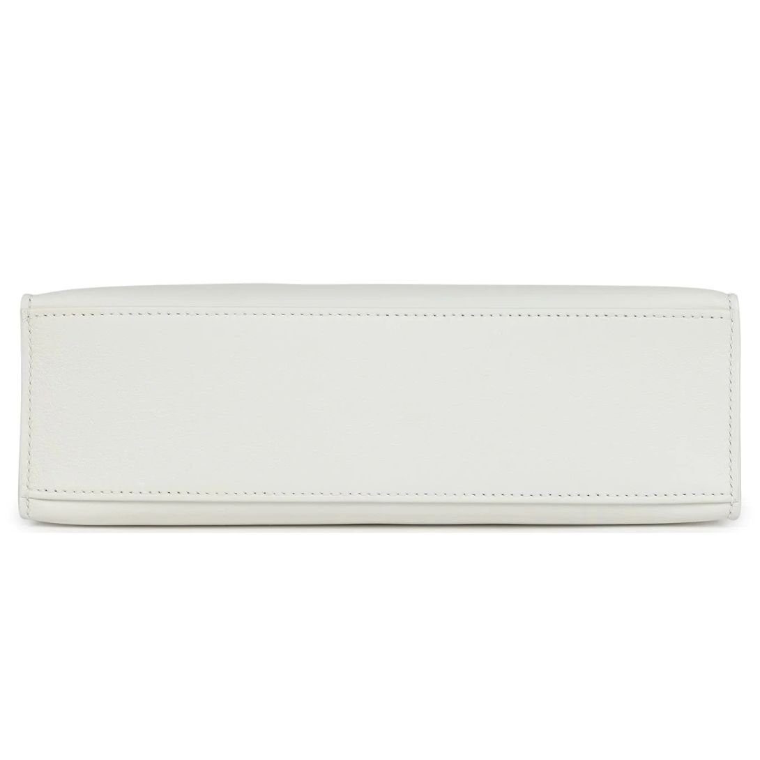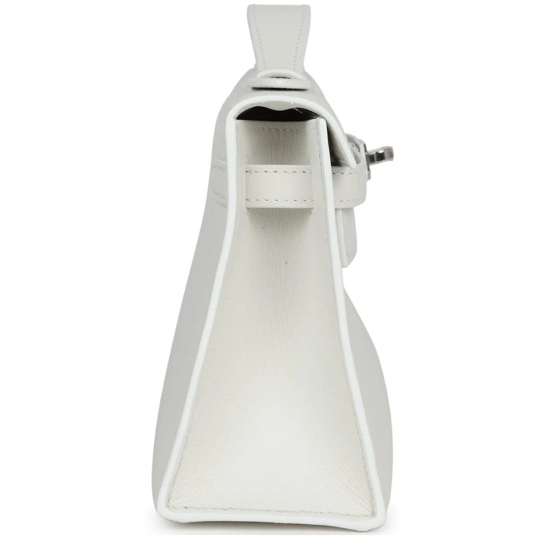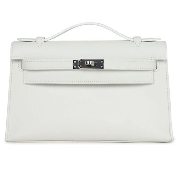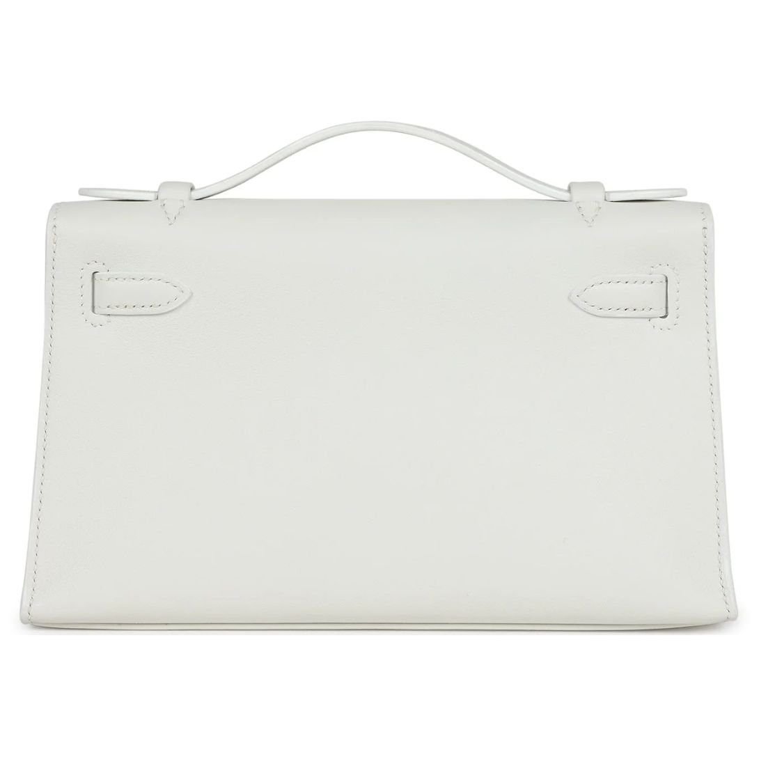 The Kelly Pochette is crafted in elegant White Swift leather, accented with palladium hardware. It features tonal stitching, a classic front flap with two straps secured by a signature toggle closure, and a sleek flat top handle for effortless sophistication.