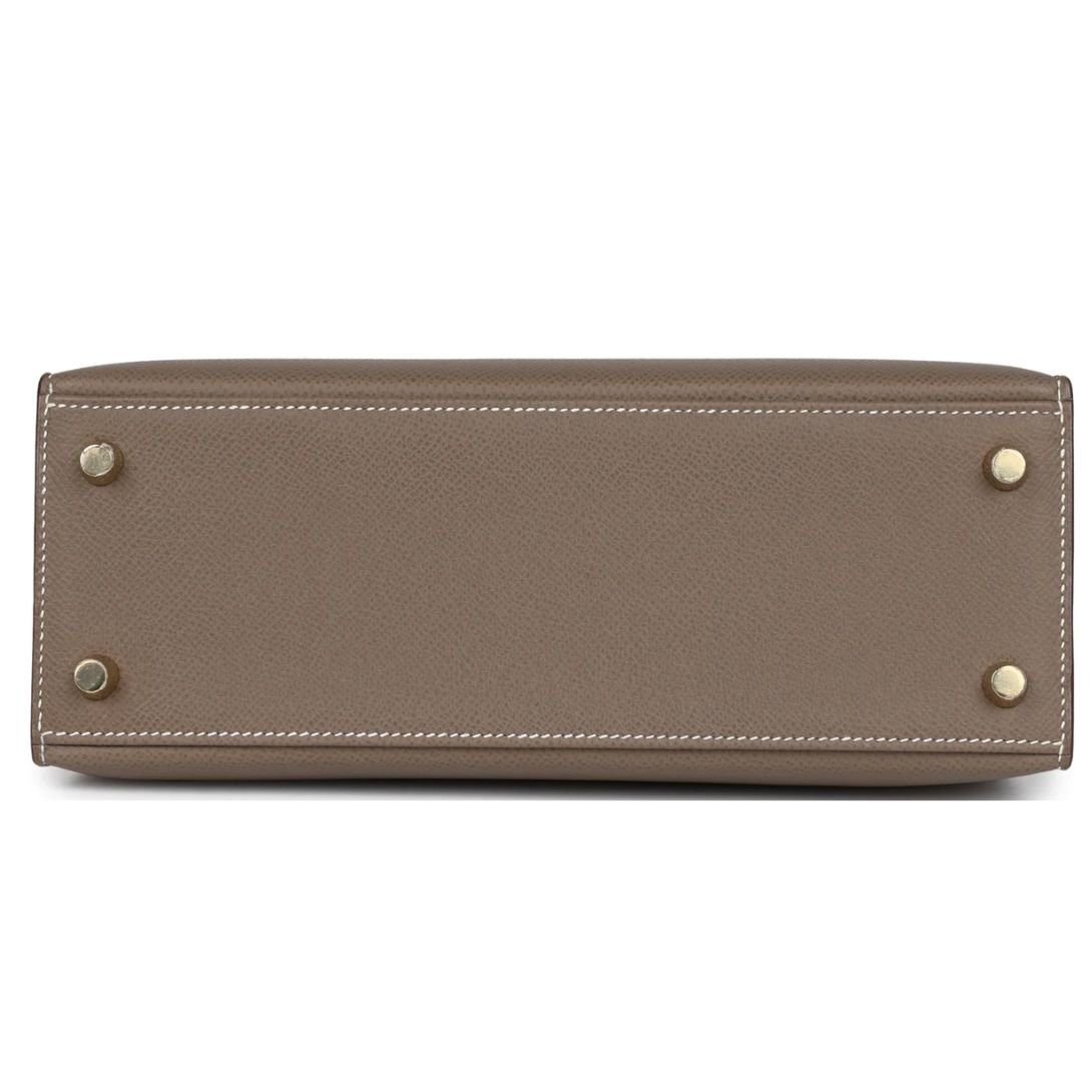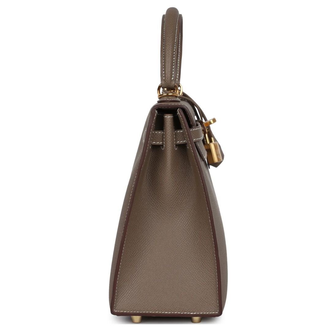This Kelly, in the Sellier style, is crafted from Etoupe Epsom leather with gold hardware. It features contrast stitching, a front flap with two straps, and a center toggle closure. The bag is equipped with a clochette, lock, and two keys, a single rolled handle, and a removable shoulder strap for versatile carrying options.