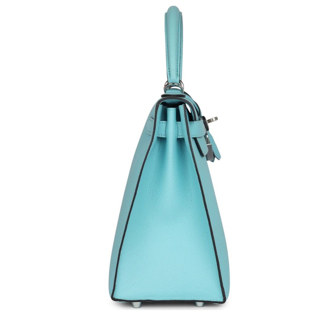 This Hermès Kelly, crafted in the Sellier style, showcases a stunning Bleu Atoll Epsom leather complemented by palladium hardware. Its elegant design features tonal stitching, two straps with a front toggle closure, a clochette with a lock and two keys, a single rolled handle, and a removable shoulder strap for added versatility.
