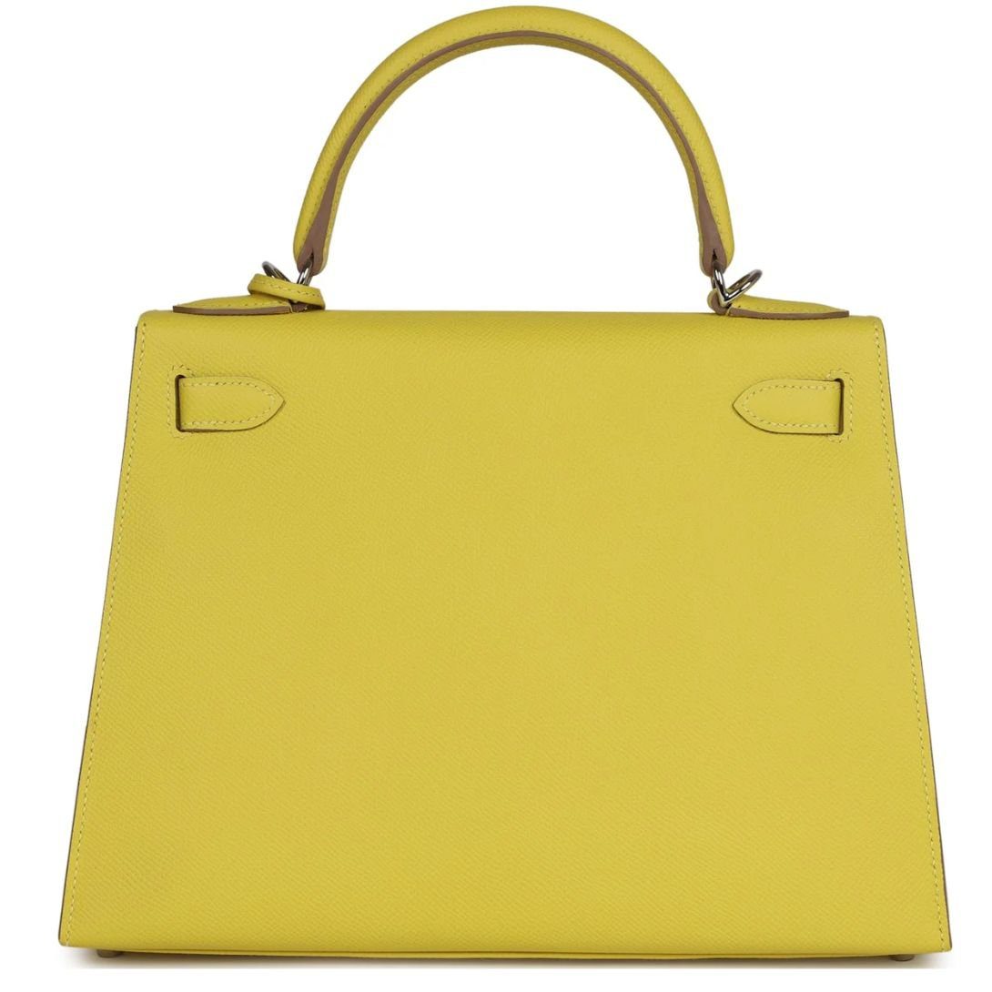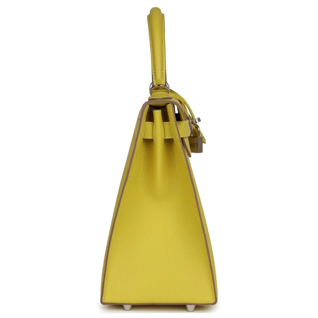 This Kelly Sellier is crafted from luxurious Lime epsom leather and features palladium hardware, tonal stitching, and a sophisticated front toggle closure. The design includes a clochette with a lock and two keys, a single rolled handle, and an optional shoulder strap for versatile carrying.