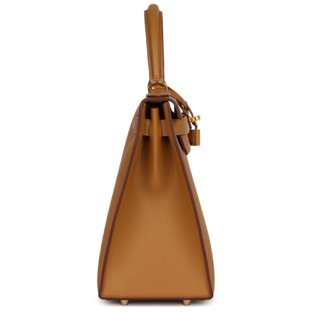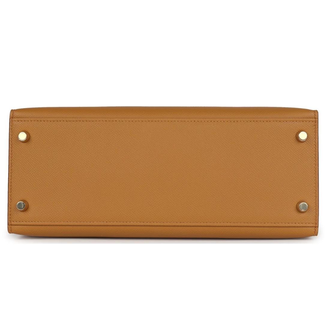 This Hermès Kelly, in the Sellier style, is crafted from Sesame Epsom leather with gold hardware. It features tonal stitching, a front flap with two straps and a center toggle closure, a clochette with a lock and two keys, a single rolled handle, and a removable shoulder strap for versatile carrying options.