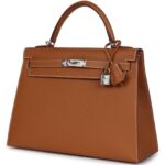 This Hermès Kelly is crafted in Gold epsom leather, featuring palladium hardware and contrast stitching. The design is in the Sellier style, known for its sharp, structured lines. The bag features two straps with a front toggle closure, a clochette with a lock and two keys, a single rolled handle, and an optional shoulder strap, combining both elegance and practicality.