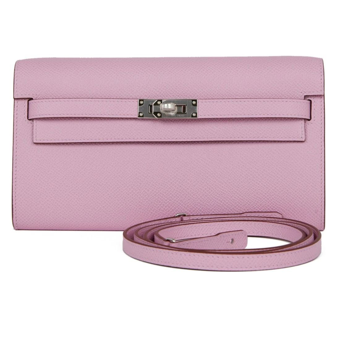 This Kelly Wallet To Go is a stylish and practical accessory, crafted from Mauve Sylvestre epsom leather and featuring palladium hardware.