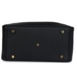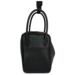 The Hermès Lindy is an elegant yet functional bag, crafted in Black Clemence leather with gold hardware. Its design features tonal stitching, double zipper pulls, the iconic Hermès twist-lock closure at the center, five protective gold feet, and dual top handles linked by a removable shoulder strap for versatile carrying options.