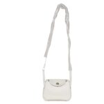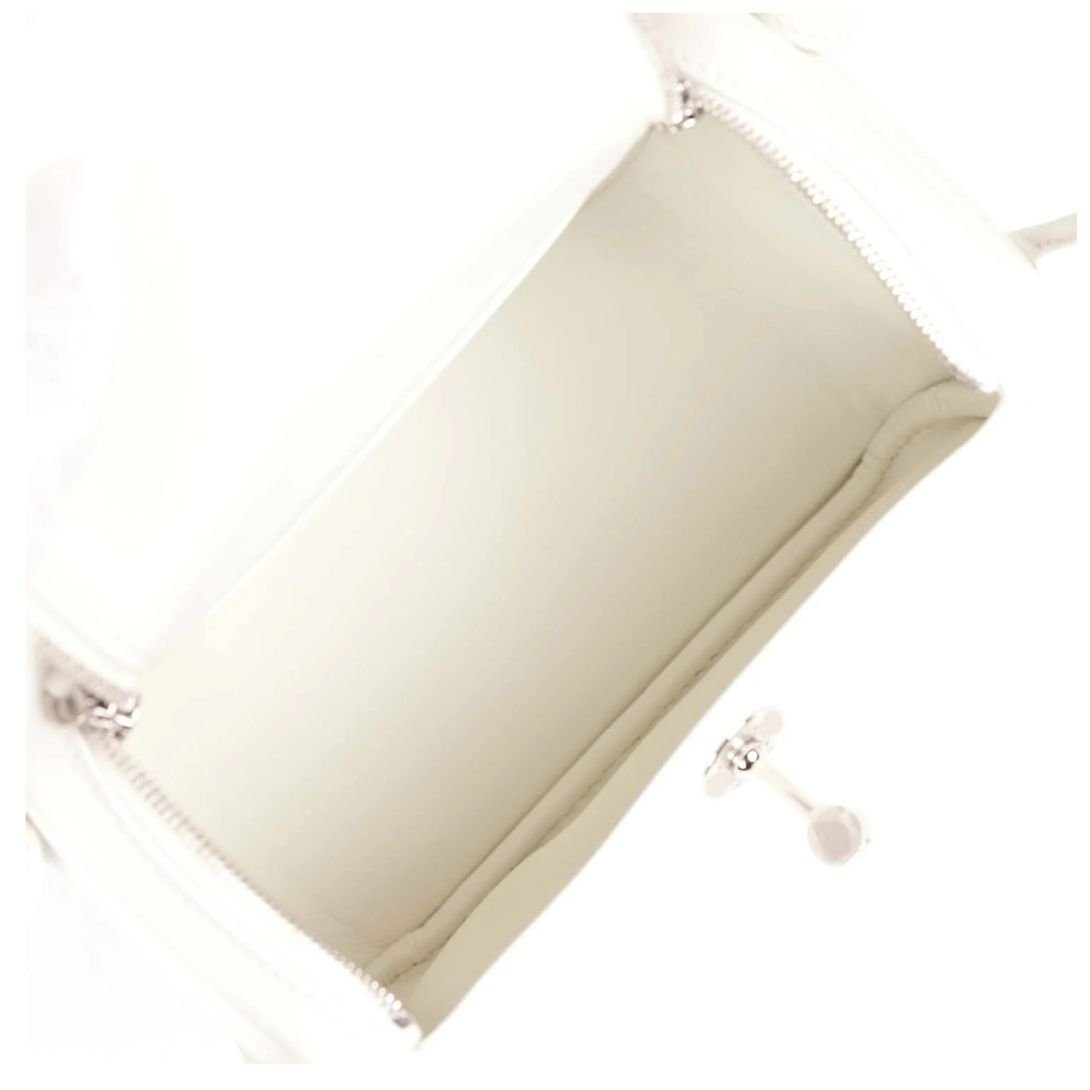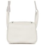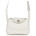 The Mini Lindy is expertly crafted in white Swift leather, complemented by palladium hardware. It features tonal stitching, double zipper pulls, a signature Hermès twist lock on the front, and a pocket on each side. The design is completed with two rolled top handles connected by a flat shoulder strap for versatile carrying options.