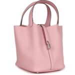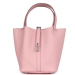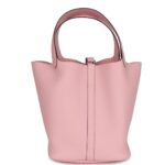 This Picotin is crafted from Rose Sakura Clemence leather with palladium hardware. It features tonal stitching and two top handles, offering a clean, minimalist design.