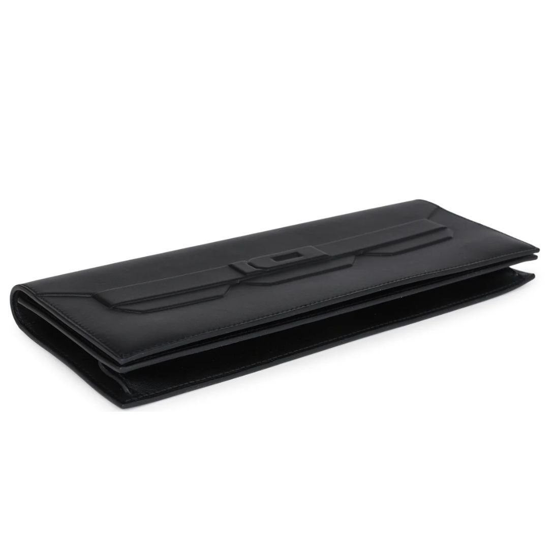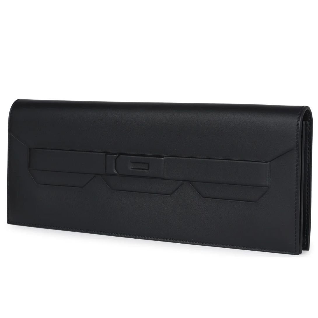 The Hermès Shadow Kelly Cut is an exquisite clutch crafted from Black Swift leather with contrast stitching. Its minimalist design features embossed straps and an embossed front toggle closure, showcasing Hermès’ signature artistry and innovation.