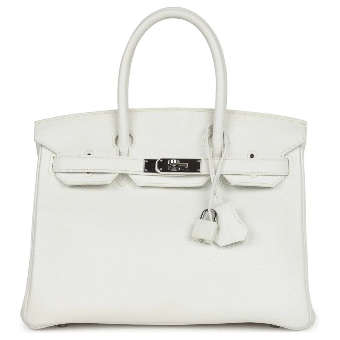 This elegant Birkin bag is crafted from a combination of White and Gris Tourterelle Clemence leather, complemented by gold hardware. It features tonal stitching, a front flap with two straps and a center toggle closure, a clochette with a lock and two keys, and double rolled handles for timeless sophistication.