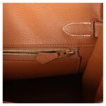 The interior is lined with Gold chevre leather, exuding understated luxury. It includes a zip pocket with an Hermès-engraved zipper pull and an open pocket on the opposite side, offering functional and organized storage space.