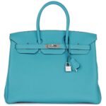 This Birkin comes with an Hermès box, dustbag, clochette, lock, two keys, clochette dustbag, rainhat, ribbon, and felt protector.