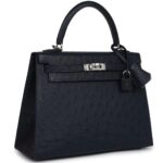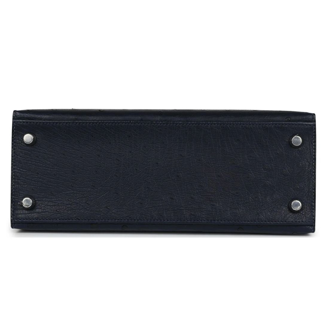This Special Order Kelly, in the Sellier style, is made from Bleu Indigo ostrich leather with palladium hardware. It features tonal stitching, two straps with a front toggle closure, a clochette with lock and two keys, a single rolled handle, and a removable shoulder strap.