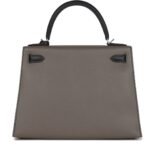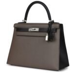 This Special Order Hermès Kelly, in the Sellier style, is crafted from Etain and Black Epsom leather with Brushed Palladium hardware. The bag features a sophisticated combination of tonal and contrast stitching, a front flap with two straps and a toggle closure, a clochette with a lock and two keys, a single rolled handle, and a removable shoulder strap for versatile use.