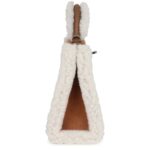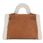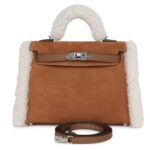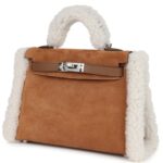 This rare Hermès Teddy Kelly is a playful yet sophisticated piece, crafted from a unique combination of Chamois and Ecru Grizzly merino sheepskin and Alezan Swift leather. It features palladium hardware, tonal stitching, a front toggle closure, a single rolled handle, and an optional removable shoulder strap for versatile wear.