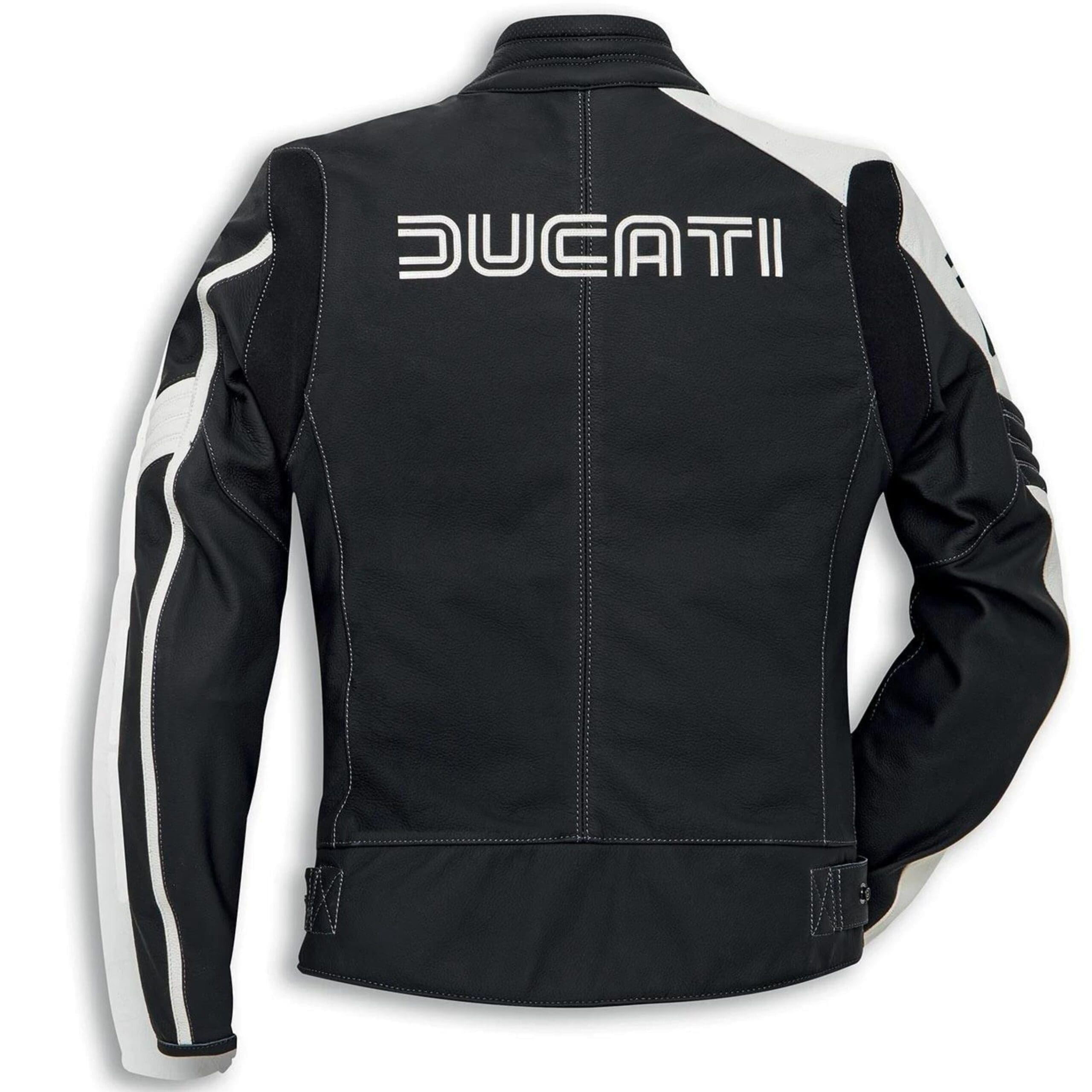 The historical Ducati 77 leather jacket is specially designed for professional bikers to fulfill their biking passion on track with great safety. This Jacket features excellent design & comfort, 100% genuine Cowhide leather, Approved internal & external Protectors on Shoulder, Elbows and Back, and YKK Zippers for Performance.