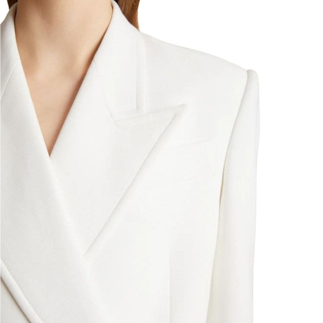 At first glance, the blazer exudes an aura of refined minimalism. Its chalk hue, a soft and understated shade of off-white, lends it an air of effortless chic. The precisely tailored silhouette is structured yet fluid, creating a flattering drape that skims the body with grace.