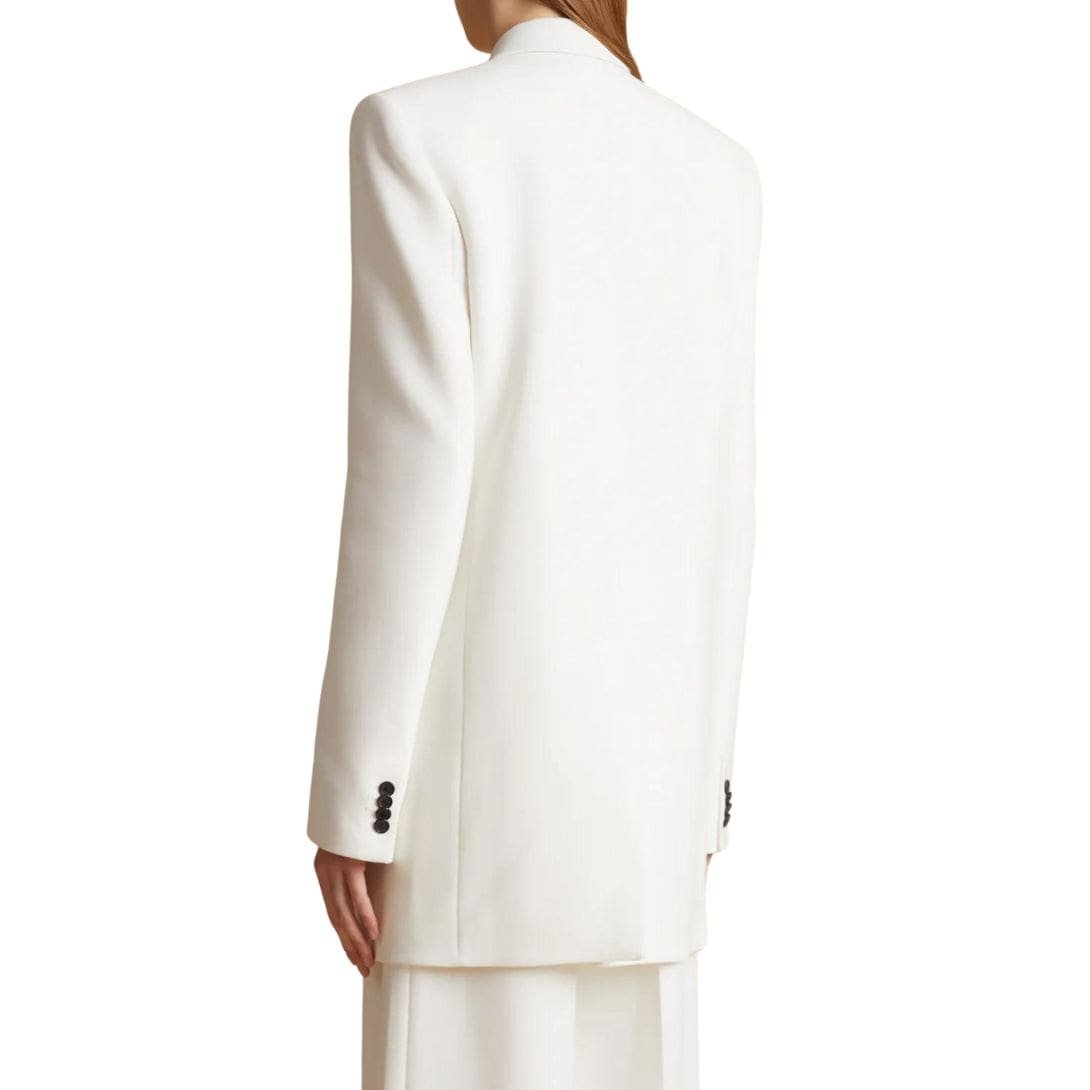 The Khaite Jacobson blazer in chalk is a masterful fusion of classic tailoring and contemporary elegance. Crafted with meticulous attention to detail, it embodies sophistication and versatility, making it a timeless addition to any wardrobe.The Khaite Jacobson blazer in chalk epitomizes sophistication with a modern edge. Crafted with meticulous attention to detail, it boasts a tailored silhouette that effortlessly combines timeless elegance with contemporary flair. The chalk hue, a soft and versatile shade of white, adds a touch of freshness and refinement to any ensemble, making it a versatile piece for various occasions.KHAITE THE JACOBSON BLAZER IN CHALK JACKET
