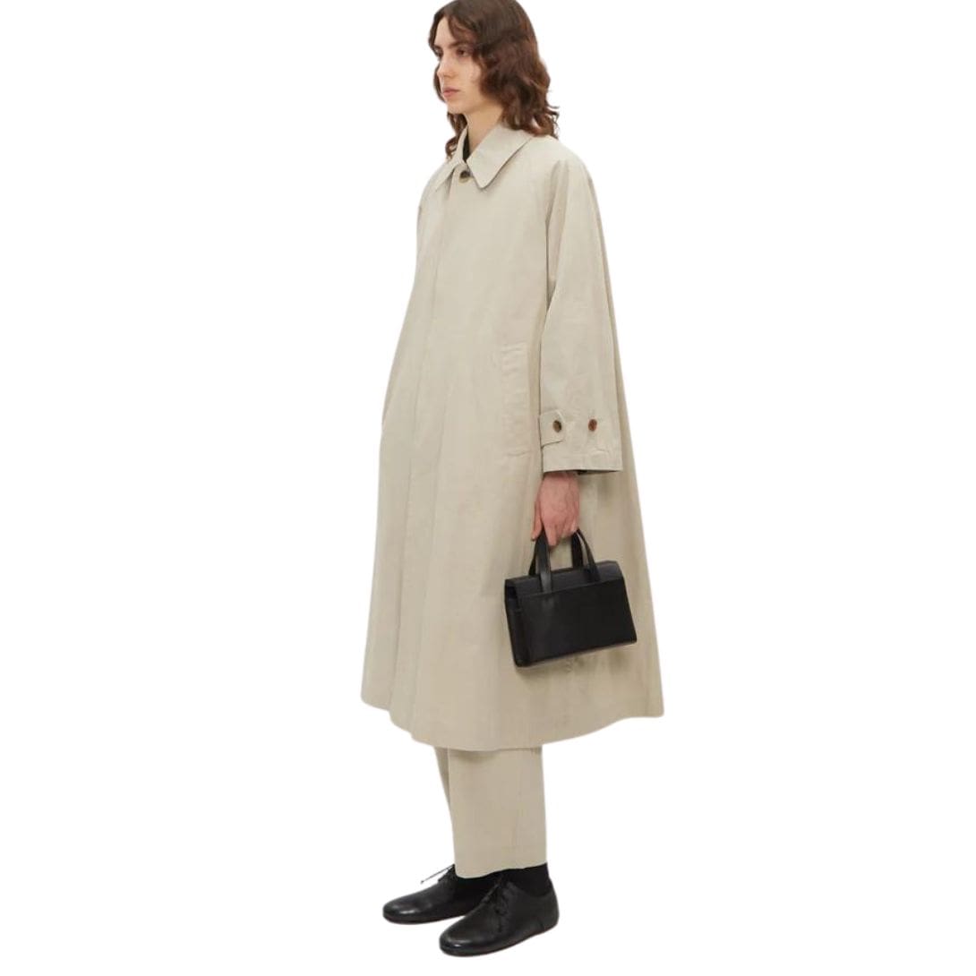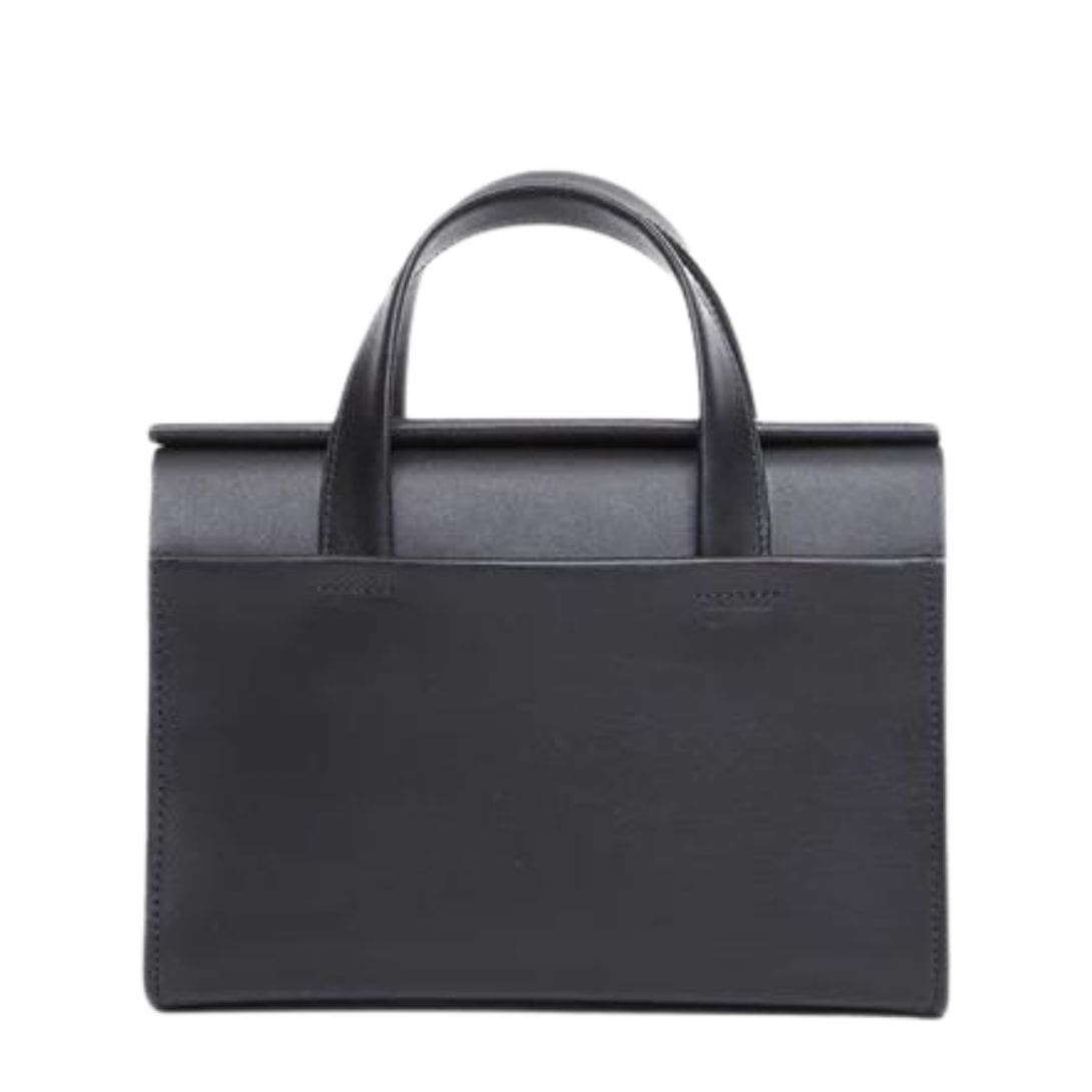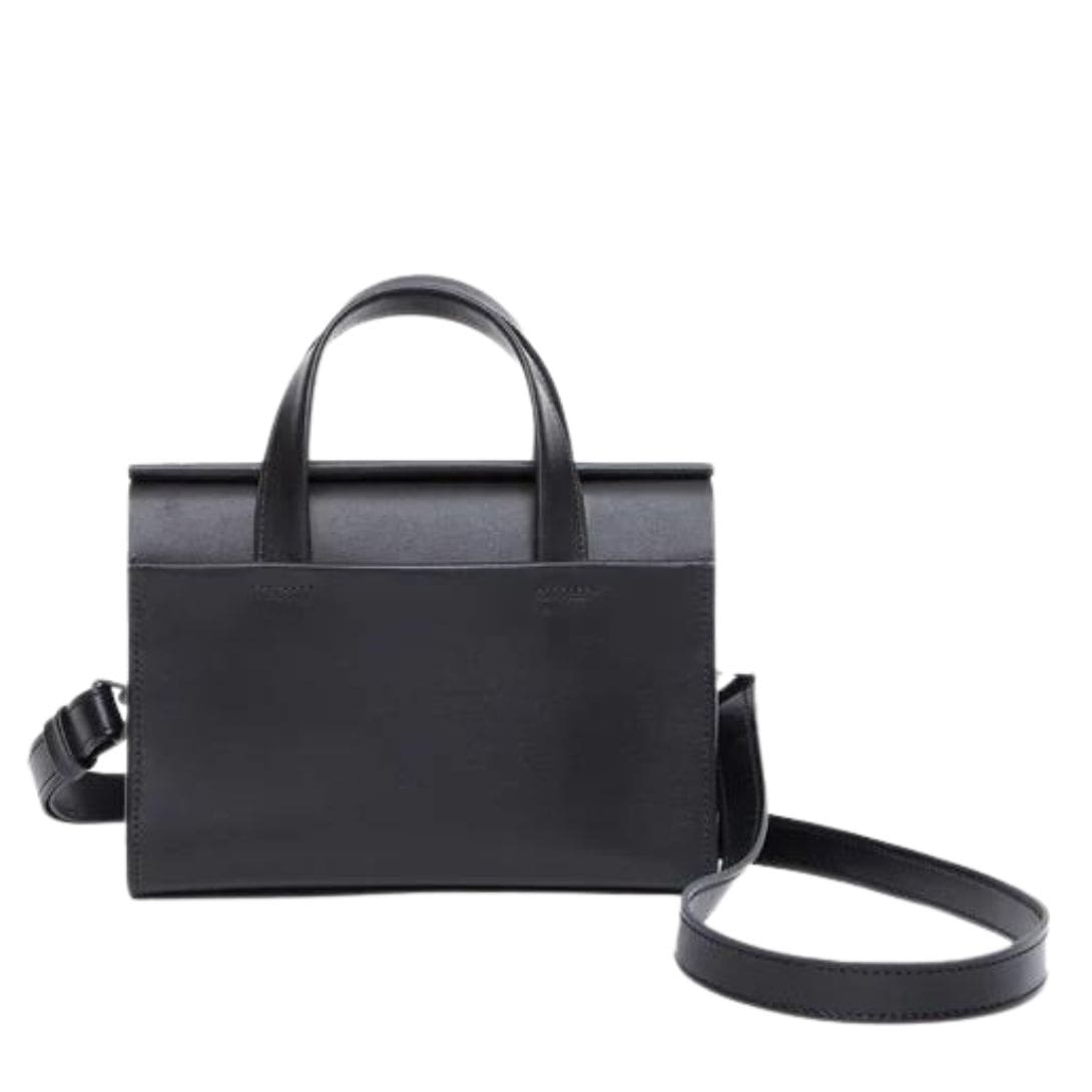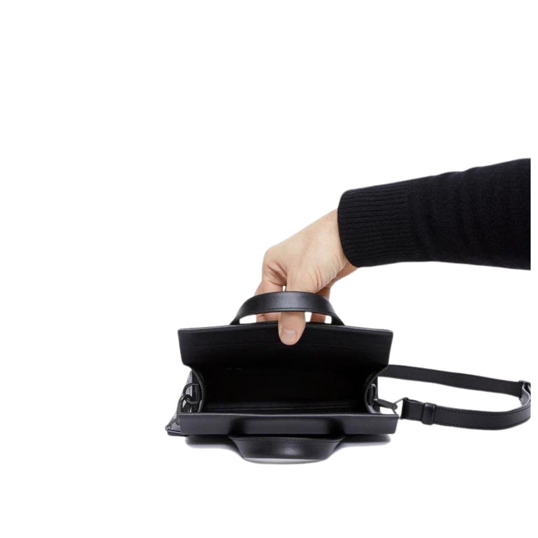 Introducing the La Garconne Saac Reina Hitchcock Mini Handbag structured satchel, now in a mini size, featuring twin top handles and a removable adjustable shoulder strap. Crafted from black double-tanned full-grain calfskin, this bag boasts a natural vegetable-wax finish that develops a unique patina over time. It is designed with two top flaps secured by concealed magnetic snap closures and large slip pockets at the sides. Inside, you’ll find a single interior slip pocket for added organization. Tonal stitching runs throughout the bag, which remains unlined for a clean aesthetic.