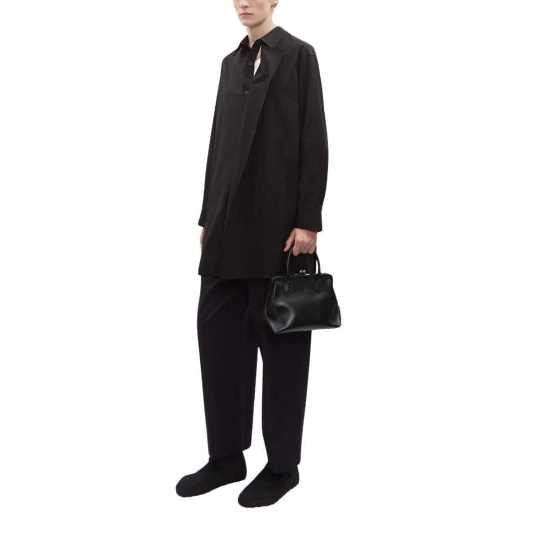 Introducing the La Garconne Y’s Clasp Closure Bag black structured bag, featuring top handles crafted from semi-glossed leather.