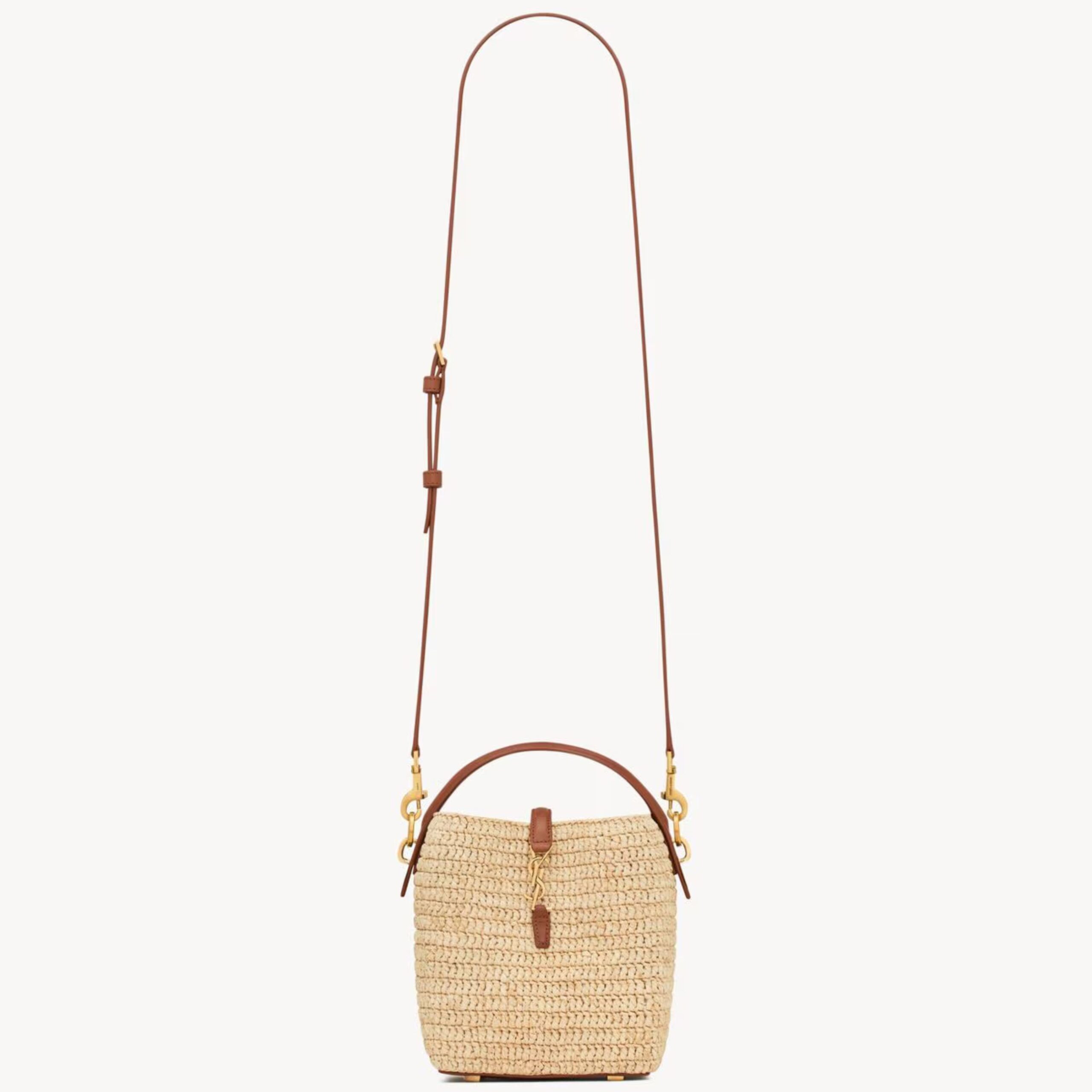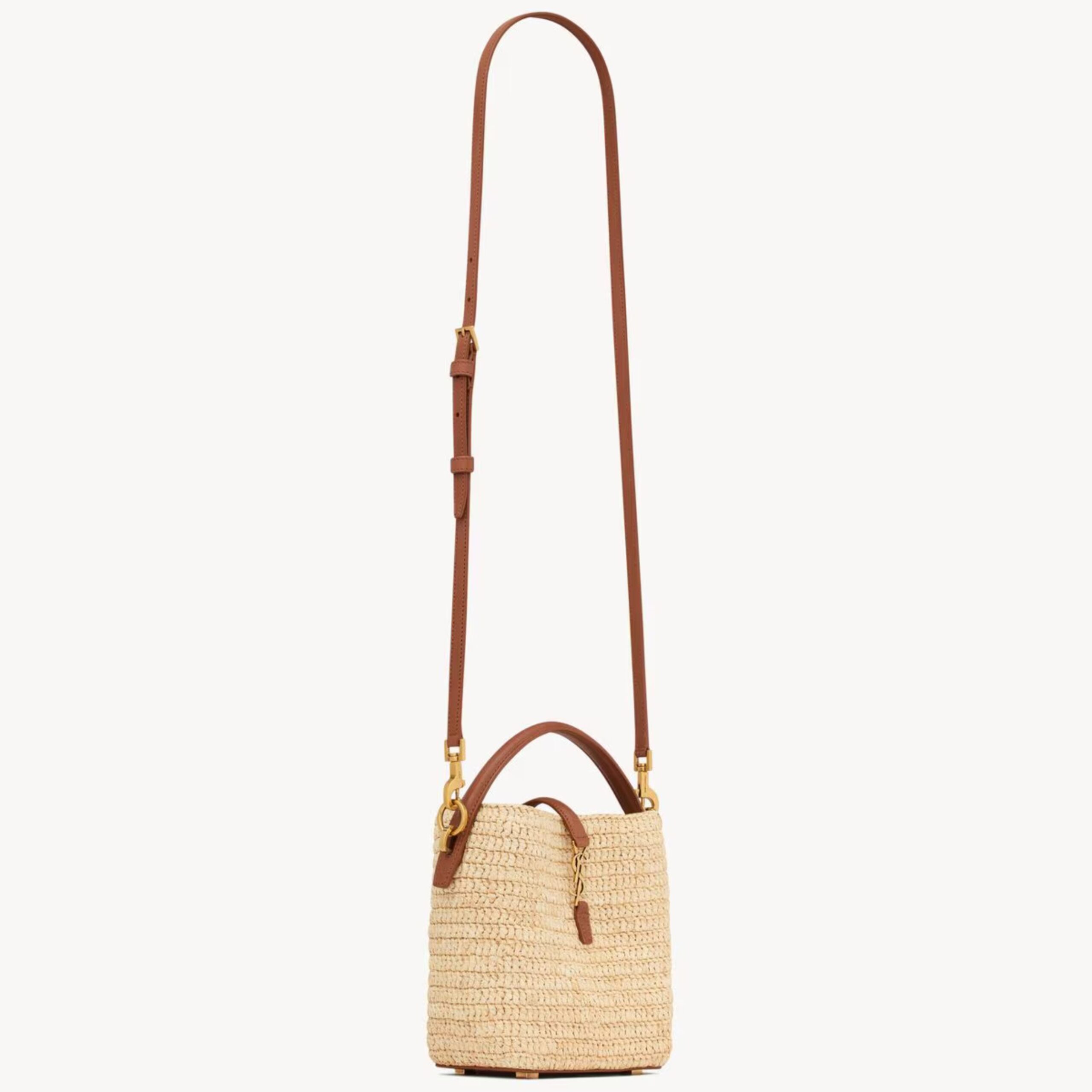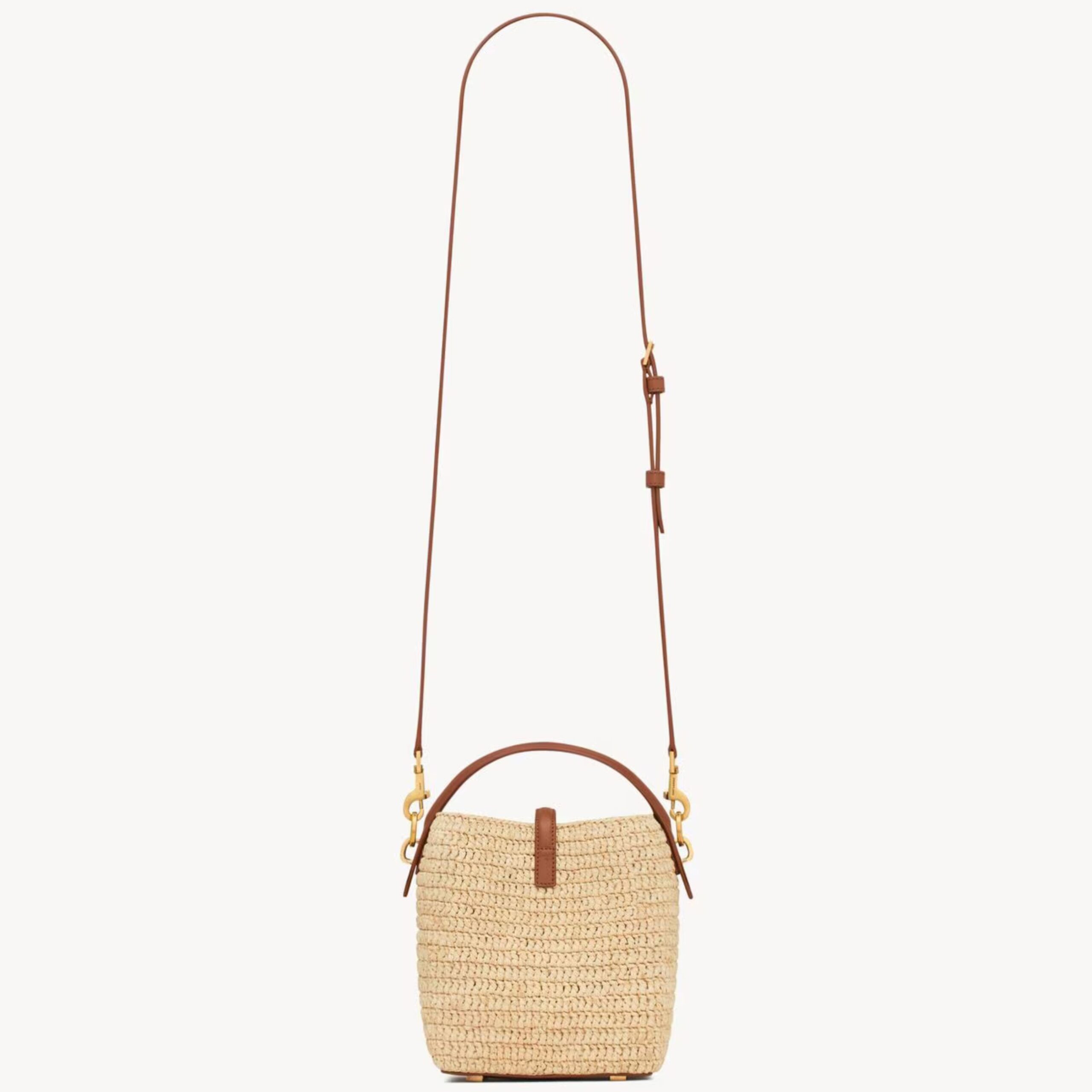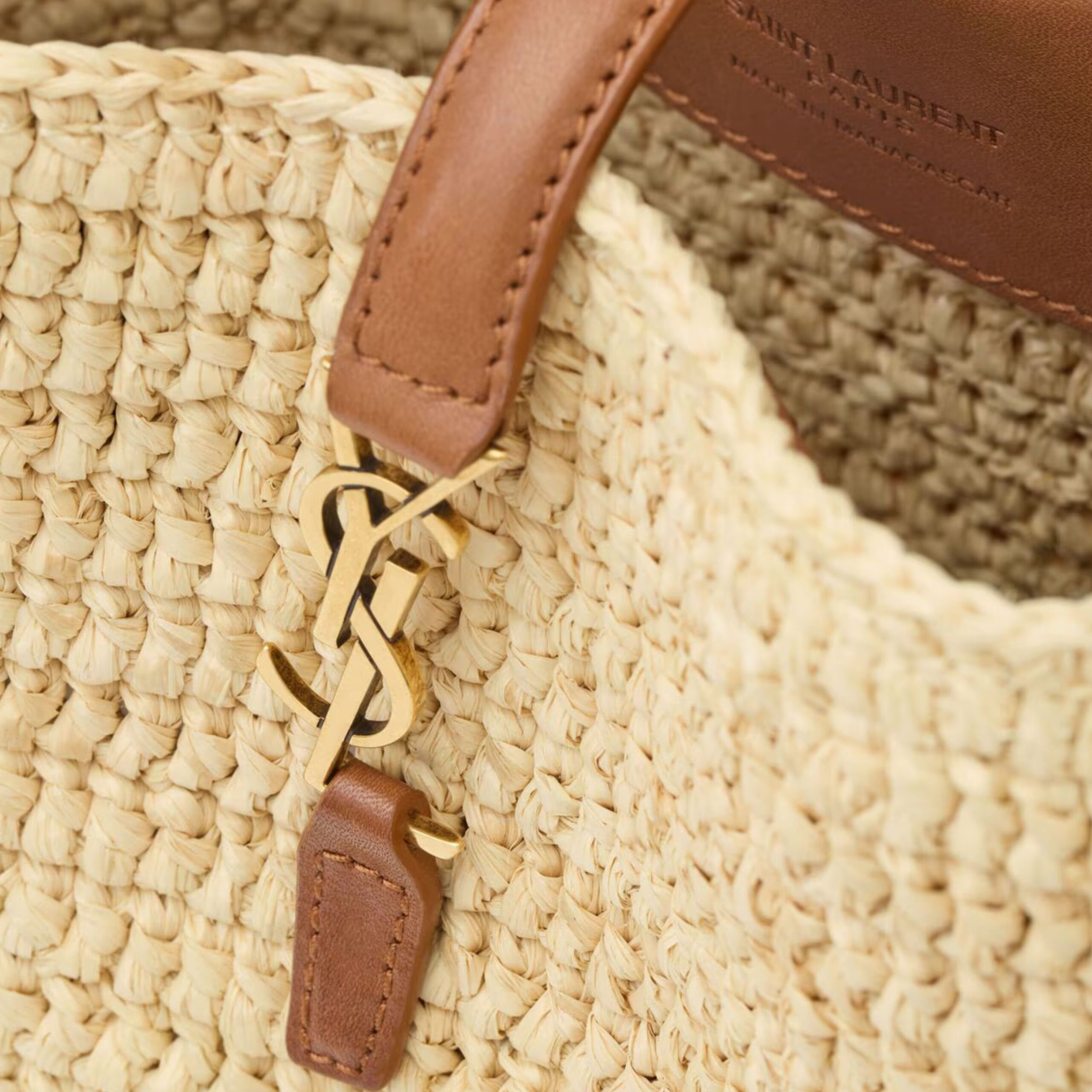 The bag features a structured, minimalist design that exudes understated luxury. The front flap is accented with the iconic YSL monogram in brushed metal, lending a sophisticated touch to the organic texture of the raffia. A tonal leather trim frames the edges, adding both durability and contrast to the soft, woven body. The top handle allows for easy hand carry, while a removable leather strap offers crossbody or shoulder styling options, making it versatile for various occasions.
