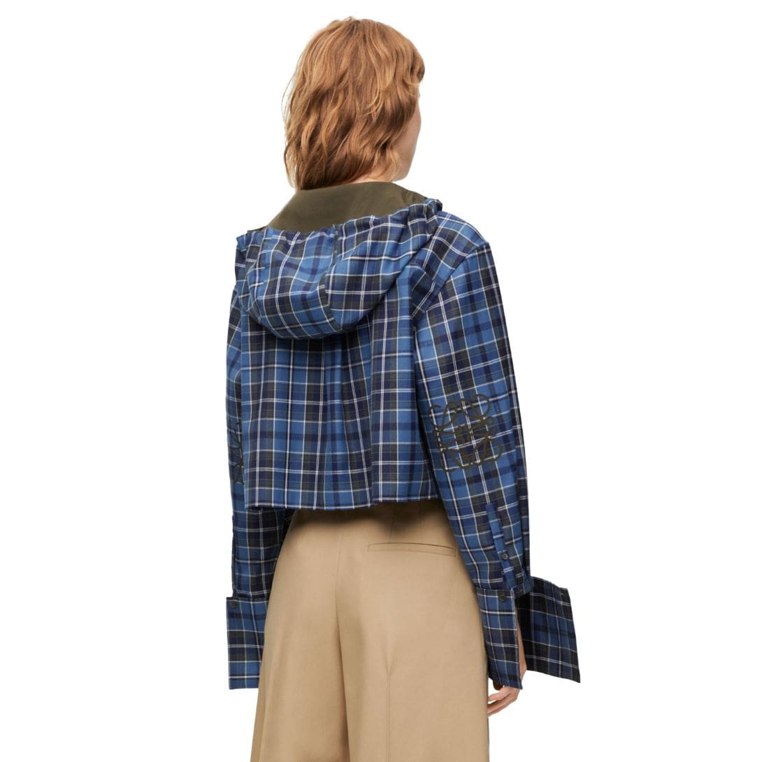 The cropped silhouette adds a fresh, avant-garde touch to the classic hooded shirt, creating a flattering fit that pairs seamlessly with both casual and elevated outfits. Loewe’s attention to detail is evident in the shirt’s construction; the carefully tailored cut enhances its sleek, modern profile. The hood, a practical yet stylish addition, provides extra protection against the elements while contributing to the shirt’s unique design.