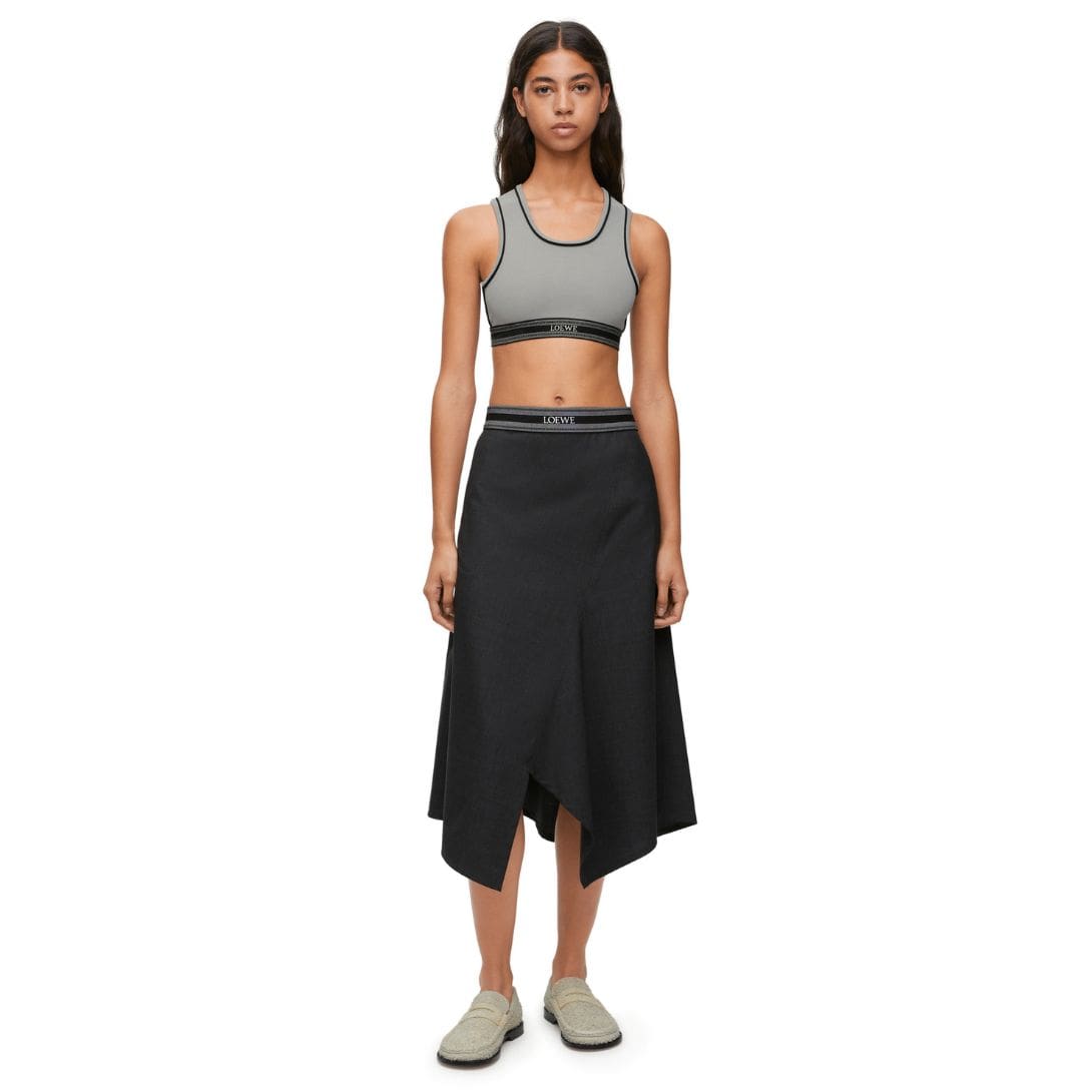 LOEWE Cropped Tank Top in Viscose blend is a masterclass in minimalist sophistication. This piece, characterized by its sleek design and high-quality material, embodies the brand’s commitment to both elegance and comfort. Crafted from luxurious viscose, the tank top offers a soft and smooth texture that drapes beautifully on the body, enhancing its refined aesthetic. The cropped cut adds a contemporary edge, making it a versatile choice for various styling options.