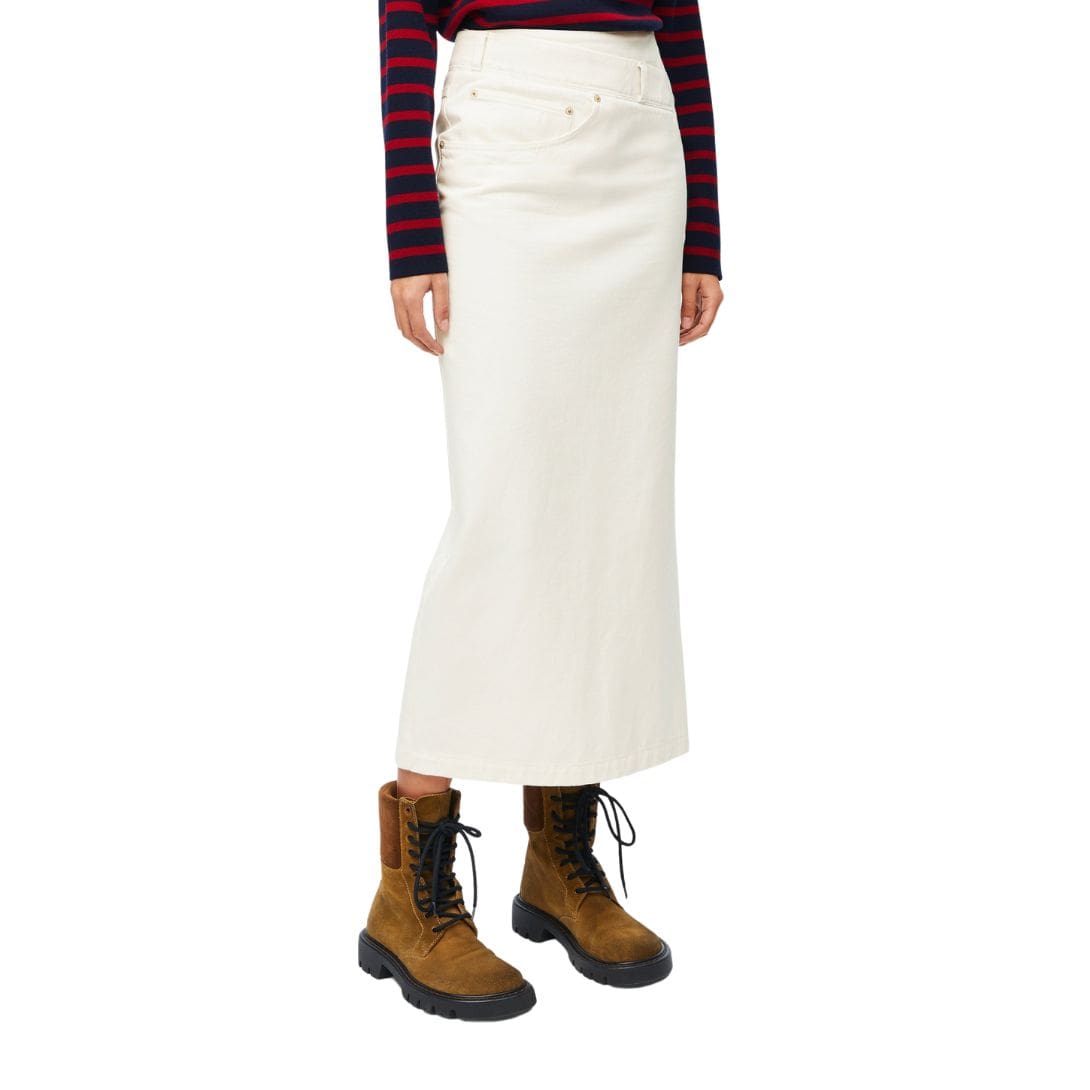 The primary material, cotton, ensures the skirt is breathable and comfortable, ideal for various occasions and climates. The white color adds a fresh, clean aesthetic, making it a versatile piece that can be paired with a wide range of tops and accessories. This neutral hue also enhances the skirt’s modern appeal, allowing it to stand out in both casual and more formal settings.