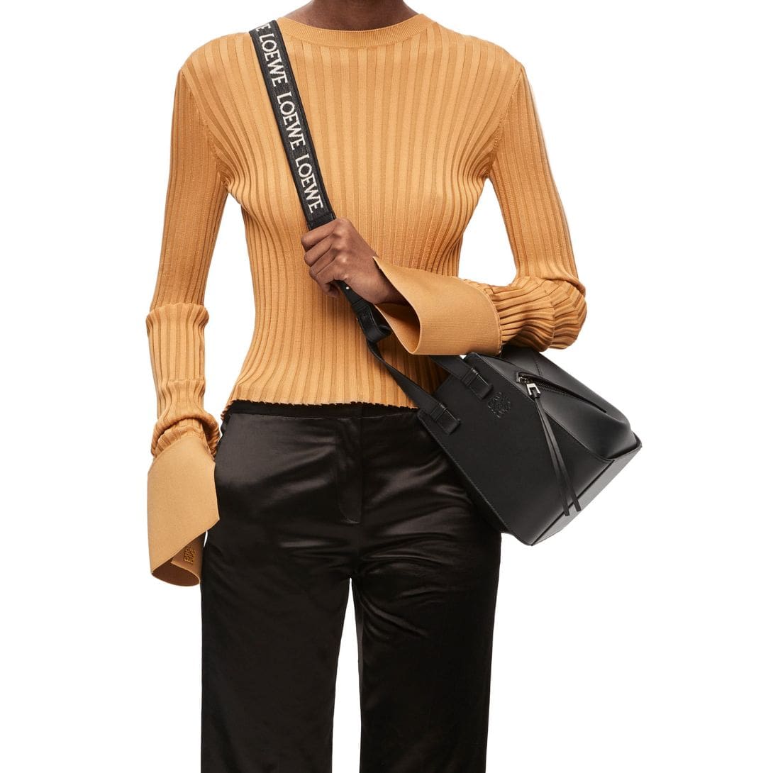 The sleek design of the Hammock Compact Bag is further accentuated by LOEWE’s impeccable craftsmanship. The satin calf leather exterior is complemented by precise stitching and high-quality hardware, reflecting the brand’s commitment to superior design and construction. Inside, the bag features well-organized compartments, ensuring your belongings are kept neatly and securely.