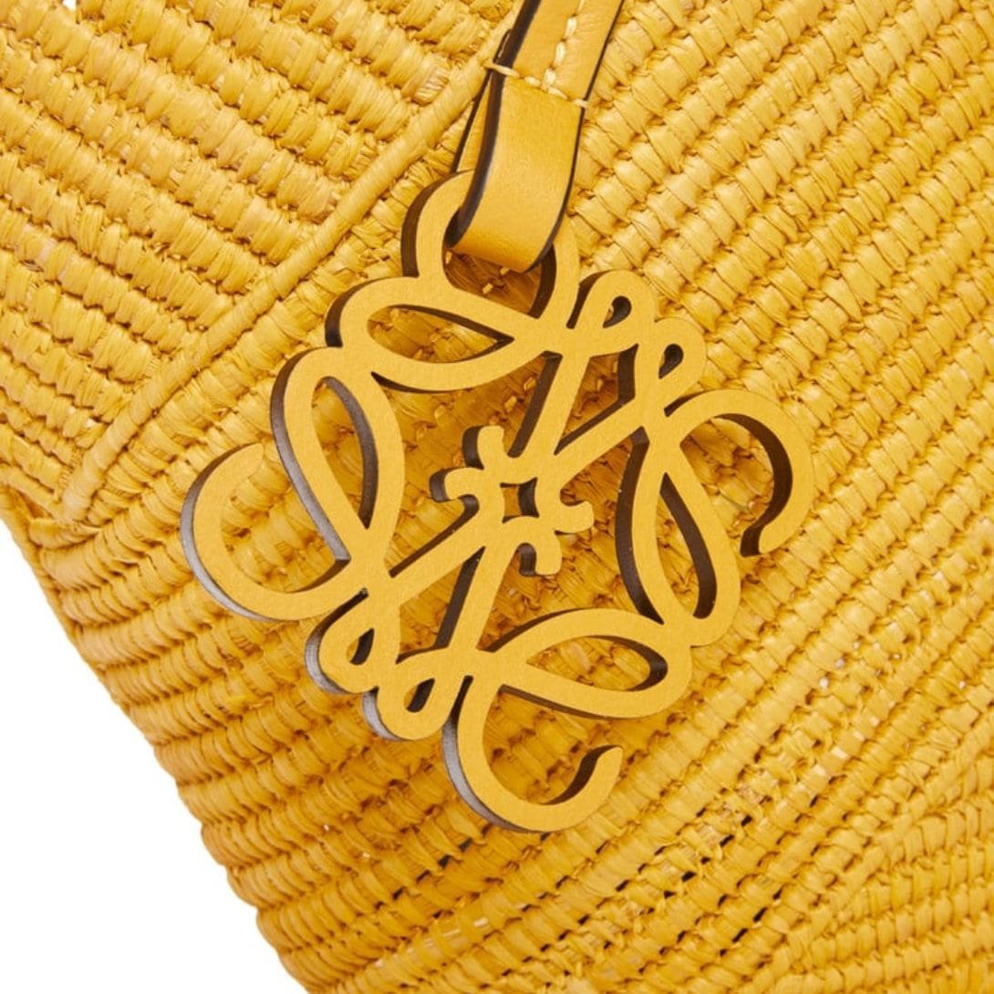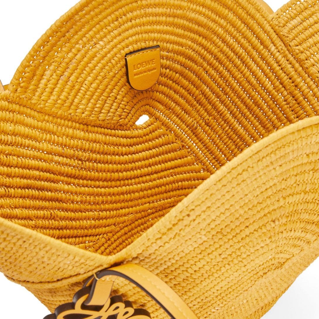 Loewe Petal Basket Bag In Raffia And Calfskin combines the natural charm of raffia with the luxurious touch of calf leather, resulting in a sophisticated and versatile accessory. The raffia provides a unique texture and rustic appeal, while the calf leather accents add refinement and durability.