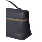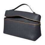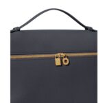 This sophisticated Loro Piana Extra Pocket L27 Blue Navy features a leather handle for a comfortable grip, complemented by a double-slider zipped closure adorned with My Charms, adding a refined and stylish touch.