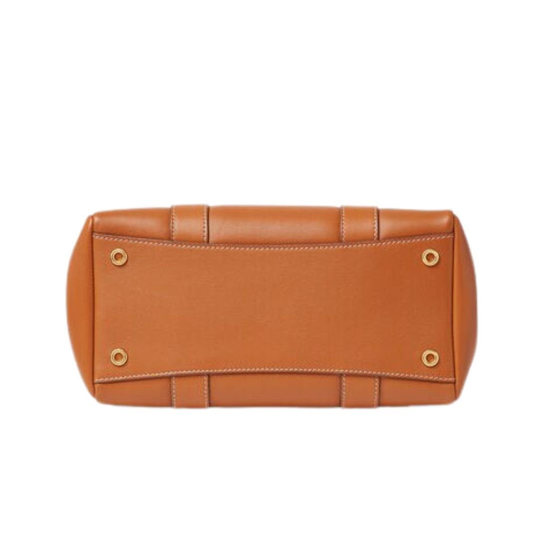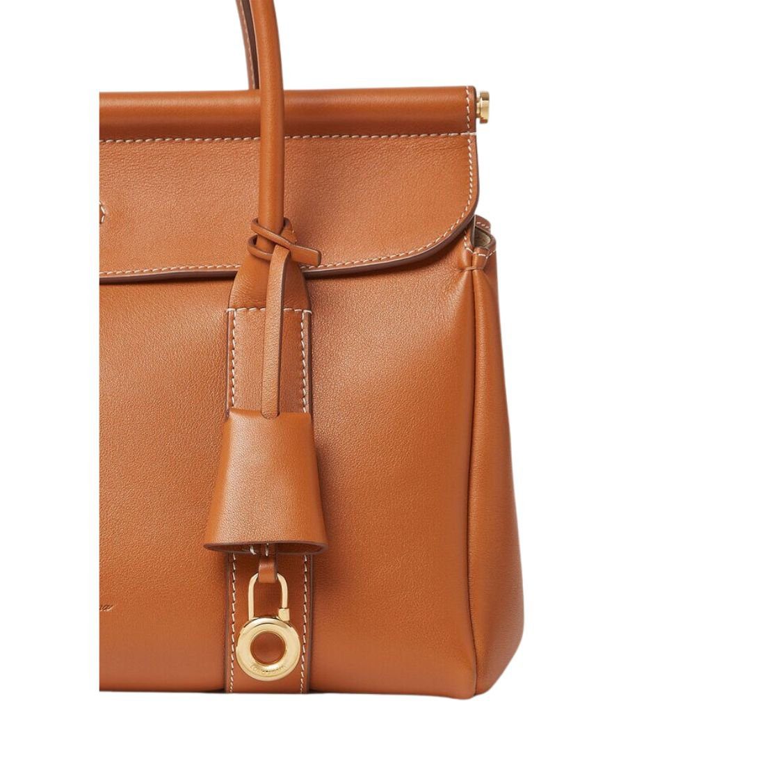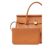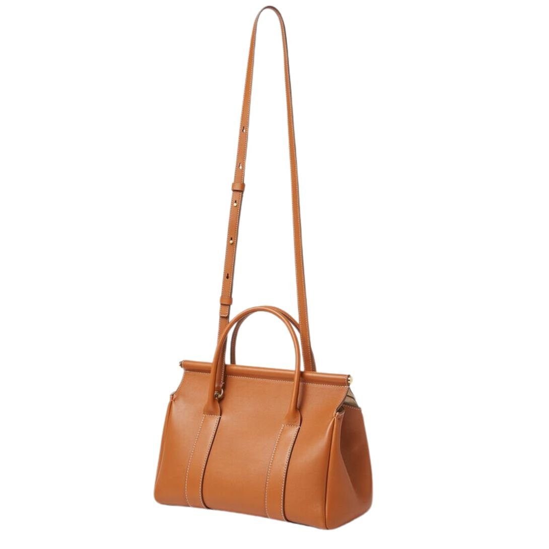 Designed for both style and functionality, this Loro Piana Loom Bag L25 Warm Tan features structured leather handles with a 6.5 cm (2.6 in) handle drop and a detachable, adjustable crossbody strap, offering multiple carrying options.