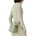 This Micro-sized Loro Piana Micro Bale Bag Light Wasabi features a detachable cotton-and-leather shoulder strap that wraps around the entire bag like a ring. The adjustable strap with two length options allows for multiple carrying styles—by hand, over the shoulder, or as a crossbody.
